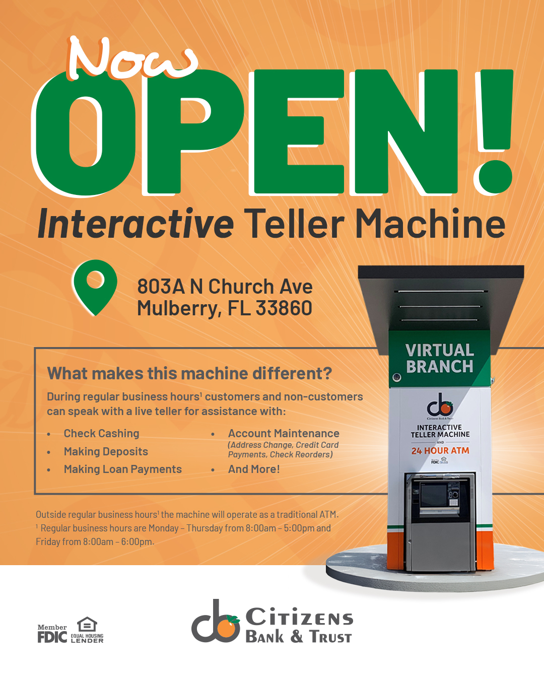 LAKE WALES, FL – Citizens Bank & Trust has installed a state-of-the-art Interactive Teller Machine (ITM) and 24-Hour ATM in the City of Mulberry. The machine, located at 803A N. Church Avenue, offers traditional ATM services to both Bank customers and non-customers. In addition, during regular business hours, users can choose to speak with a live Citizens Bank & Trust teller, who can assist with transactions traditionally performed in-person at a bank office location. Regular business hours are Monday – Thursday from 8:00am – 5:00pm and Friday from 8:00am – 6:00pm.